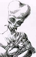 Zeichnung des Ausländers von Zeta-Reticulis mit einem Kind.