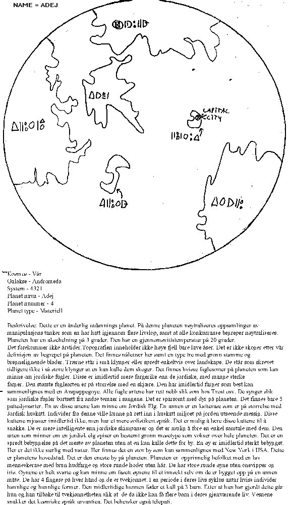 Beskrivelse: Dette er en ånderlig utdannings planet.På denne planeten nøytraliseres oppsamlinger av manipulasjons tanker som en har hatt igjennom flere livsløp,samt at alle konkurranse begreper nøytraliseres.Planeten har en aksehelning på 3 grader.Den har en gjennomsnittstemperatur på 20 grader. Det forekommer ikke årstider.Topografien inneholder ikke h¿ye fjell bare lave åser.Det er ikke skoger etter vår definisjon av begrepet på planeten.Det finnes nåletrær her samt en type tre med grønn stamme og bregnelignende blader.Trærne står i små klynger eller spredt enkeltvis over landskape.De står som skrevet tidligere ikke i så store klynger at en kan kalle dem skoger.Det finnes visse fuglesorter på planeten som kan minne om jordiske fugler.Disse er imidlertid mere fargerike enn de jordiske,med mange sterke farger.Den største fuglearten er på størrelse med en skjære.Den har imidlertid farger som best kan sammenlignes med en Arapappegøye.Alle fugle artene har rett nebb slik som hos Trost osv.De synger slik som jordiske fugler bortsett fra andre temaer i sangene.Det er sparsomt med dyr på planeten.Det finnes bare 5 pattedyrsarter.En av disse artene kan minne om Jordisk Elg.En annen er en katterase som er på størrelse med Jordisk huskatt.Individer fra denne ville kunne gå rett inn i huskatt miljøetpå jorden utseende messig.Disse kattene mjøauer imidlertid ikke,men har et mere sofistikert språk.Det er mulig å lære disse kattene til å snakke. De er mere intelligente enn jordiske skimpanser og det er mulig å føre en enkel samtale med dem.Den arten som minner om en jordisk elg spiser en bestemt grønn mosetype som vokser over hele planeten.Det er en spredt bebyggelse på det meste av planeten uten at en kan kalle dette for by. En øy er imidlertid sterkt bebygget.Her er det ikke særlig med natur. Her finnes det en stor by som kan sammenlignes med New York i USA.Dette er planetens hovedstad.Det er den eneste by på planeten.Planeten er opprinnelig befolket med en lav menneskerase med brun hudfarge og store runde hoder uten hår.De har store runde øyne uten ønevipper og iris.Øynene er helt svarte og kan minne om fasett øynene til et innsekt selv om de er bygget opp på en annen måte.De har 4 fingere på hver hånd og de er tvekjønnet.I en periode i deres livs syklus antar visse individer hannlige og hunnlige former.Den midlertidige hunnen føder et kull på 3 barn.Etter at hun har gjordt dette går hun og han tilbake til tvekjønnetheten slik at dem da ikke kan få flere barn i deres daværende liv.Vesnene snakker det kosmiske språk urvantica.Det behersker også telepati.