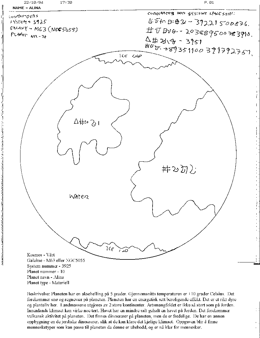 | Beskrivels: Planeten har en aksehelling på 5 grader. Gjennomsnitts temperaturen er +10 grader Celsius. Det forekommer snø og regnevær på planeten.Planeten har en energetisk sett beroligende effekt.Det er et rikt dyre og planteliv her. Landmassene utgjøres av 2 store kontinenter.Artsmangfoldet er ikke så stort som på Jorden.Innenlands klimaet kan virke noe tørt.Havet har en mindre salt gehalt en havet på Jorden.Det forekommer vulkansk avktivitet på planeten. Det finnes dinosaurer på planeten,men de er fredelige. De har en annen oppbygningen de jordiske dinosaurer,slik at de kan klare det kjølige klimaet. Oppgaven blir å finne mennesketyper som kan passe til planeten da denne er ubebodd,og er nå klar for mennesker. |