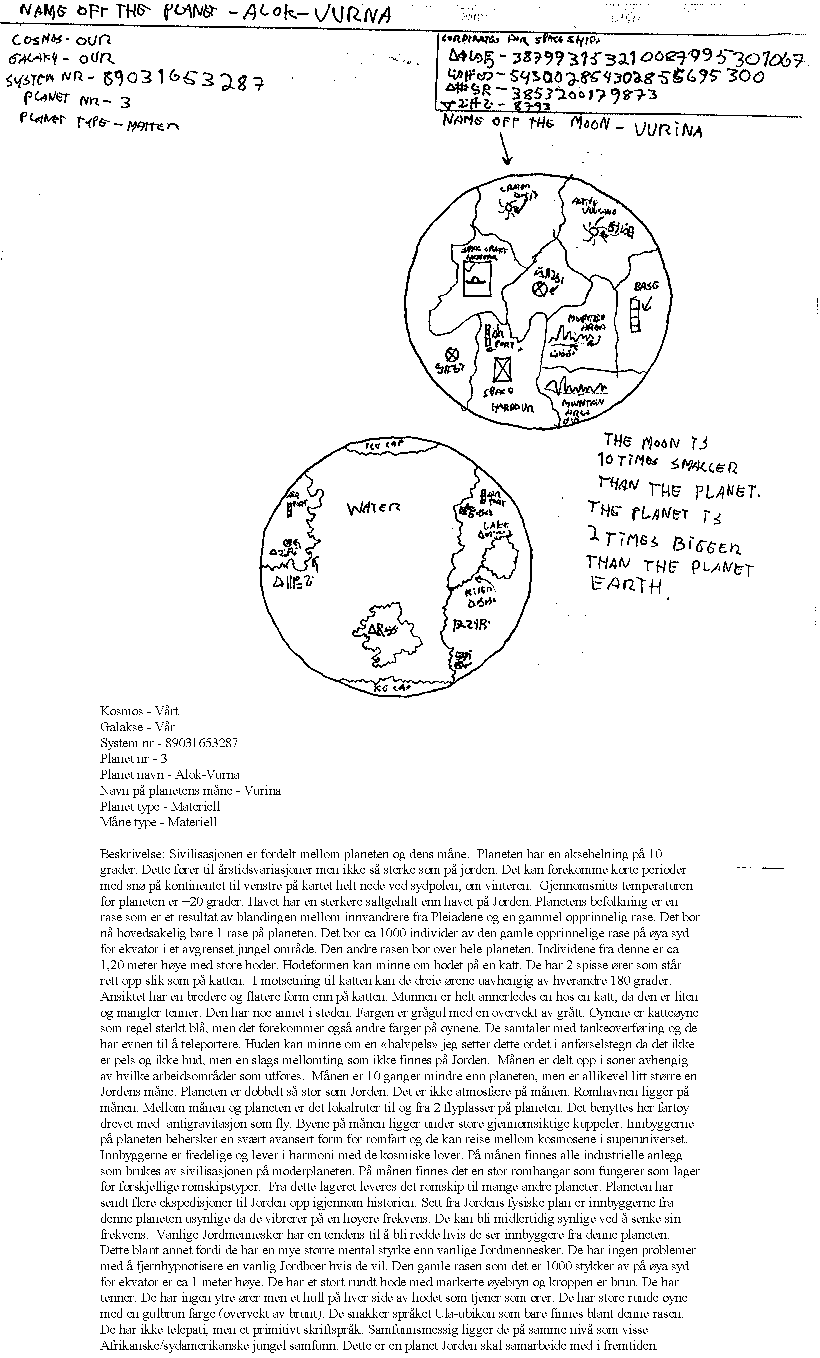 Beskrivelse: Sivilisasjonen er fordelt mellom planeten og dens måne. Planeten har en aksehelning på 10 grader.Dette fører til årstidsvariasjoner men ikke så sterke som på jorden.Det kan forekomme korte perioder med snø på kontinentet til venstre på kartet helt nede ved sydpolen,om vinteren. Gjennomsnitts temperaturen for planeten er +20 grader.Havet har en sterkere saltgehalt enn havet på Jorden.Planetens befolkning er en rase som er et resultat av blandingen mellom innvandrere fra Pleiadene og en gammel opprinnelig rase.Det bor nå hovedsakelig bare 1 rase på planeten.Det bor ca 1000 individer av den gamle opprinnelige rase på øya syd for ekvator i et avgrenset jungel område.Den andre rasen bor over hele planeten.Individene fra denne er ca 1,20 meter høye med store hoder.Hodeformen kan minne om hodet på en katt.De har 2 spisse ører som står rett opp slik som på katten. I motsetning til katten kan de dreie ørene uavhengig av hverandre 180 grader. Annsiktet har en bredere og flatere form enn på katten.Munnen er helt annerledes en hos en katt,da den er liten og mangler tenner.Den har noe annet i steden.Fargen er grågul med en overvekt av grått.Øynene er katteøyne somregel sterkt blå,men det forekommer også andre farger på øynene.De samtaler med tankeoverføring og de har evnen til å teleportere.Huden kan minne om en "halvpels" jeg setter dette ordet i anførseltegn da det ikke er pels og ikke hud,men en slags mellomting som ikke finnes på Jorden. Månen er delt opp i soner avhengig av hvilke arbeidsområder som utføres. Månen er 10 ganger mindre enn planeten,men er allikevel litt større en Jordens måne.Planeten er dobbelt så stor som Jorden.Det er ikke atmosfære på månen.Romhavnen ligger på månen.Mellom månen og planeten er det lokalruter til og fra 2 flyplasser på planeten.Det benyttes her fartøy drevet med antigravitasjon som fly.Byene på månen ligger under store gjennomsiktige kuppeler.Inbyggerne på planeten behersker en svært avansert form for romfart og de kan reise mellom kosmosene i superuniverset.Innbyggerne er fredelige og lever i harmoni med de kosmiske lover.På månen finnes alle industrielle anlegg som brukes av sivilisasjonen på moderplaneten.På månen finnes det en stor romhangar som fungerer som lager for forskjellige romskipstyper. Fra dette lageret leveres det romskip til mange andre planeter.Planeten har sendt flere ekspedisjoner til Jorden opp igjennom historien.Sett fra Jordens fysiske plan er innbyggerne fra denne planeten usynlige da de vibrerer på en høyere frekvens.De kan bli midlertidig synelige ved å senke sin frekvens. Vanlige Jordmennesker har en tendens til å bli redde hvis de ser innbyggere fra denne planeten.Dette blandt annet forde de har en mye større mental styrke enn vanlige Jordmennesker.De har ingen problemer med å fjernhypnotisere en vanlig Jordboer hvis de vil.Den gamle rasen som det er 1000 stykker av på øya syd for ekvator er ca 1 meter høye.De har et stort rundt hode med markerte øyebryn og kroppen er brun.De har tenner.De har ingen ytre ører men et hull på hver side av hodet som tjener som ører.De har store runde øyne med en gulbrun farge (overvekt av brunt).De snakker språket Ula-ubikon som bare finnes blandt denne rasen.De har ikke telepati,men et primitivt skriftspråk.Samfunnsmessig ligger de på samme nivå som hvisse Afrikanske/sydamerikanske jungel samfunn. Dette er en planet Jorden skal sammarbeide med i fremtiden.
