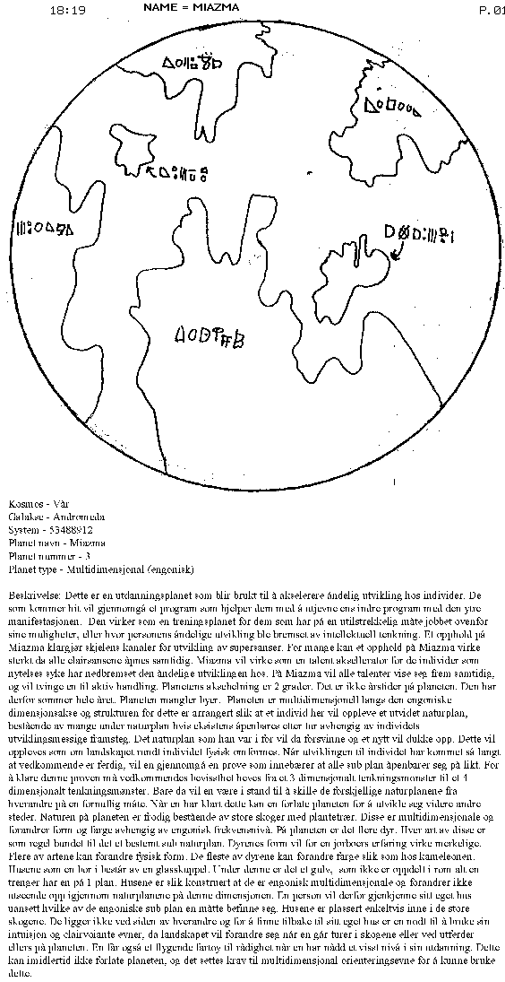 | Beskrivelse: Dette er en utdanningsplanet som blir brukt til å aksellerere ånderlig utvikling hos individer.De som kommer hit vil gjennomgå et program som hjelper dem med å utgjevne ens indre program med den ytre manifestasjonen. Den virker som en treningsplanet for dem som har på en utilstrekkelig måte jobbet ovenfor sine muligheter,eller hvor personens ånderlige utvikling ble bremset av intellektuell tenkning.Et opphold på Miazma klargjør skjelens kanaler for utvikling av supersanser.For mange kan et opphold på Miazma virke sterkt da alle clairsansene åpnes samtidig.Miazma vil virke som en talent aksellerator for de individer som nytelses syke har nedbremset den ånderlige utviklingen hos.På Miazma vil alle talenter vise seg frem samtidig,og vil tvinge en til aktiv handling.Planetens aksehelning er 2 grader.Det er ikke årstider på planeten.Den har derfor sommer hele året.Planeten mangler byer. Planeten er multidimensjonell langs den engoniske dimensjonsakse og strukturen for dette er arangert slik at et individ her vil oppleve et utvidet naturplan,bestående av mange under naturplan hvis eksistens åpenbares etter tur avhengig av individets utviklingsmessige framsteg.Det naturplan som han var i før vil da forsvinne og et nytt vil dukke opp.Dette vil oppleves som om landskapet rundt individet fysisk omformes.Når utviklingen til individet har kommet så langt at vedkommende er ferdig,vil en gjennomgå en prøve som innebærer at alle sub plan åpenbarer seg på likt.For å klare denne prøven må vedkommendes bevissthet heves fra et 3 dimensjonalt tenkningsmønster til et 4 dimensjonalt tenkningsmønster.Bare da vil en være i stand til å skille de forskjellige naturplanene fra hverandre på en fornuftig måte.Når en har klart dette kan en forlate planeten for å utvikle seg videre andre steder.Naturen på planeten er frodig bestående av store skoger med plantetrær.Disse er multidimensjonale og forandrer form og farge avhengig av engonisk frekvensnivå.På planeten er det flere dyr.Hver art av disse er somregel bundet til det et bestemt sub naturplan.Dyrenes form vil for en jorboers erfaring virke merkelige.Flere av artene kan forandre fysisk form.De fleste av dyrene kan forandre farge slik som hos kamelonen.Husene som en bor i består av en glasskuppel.Under denne er det et gulv,som ikke er oppdelt i rom alt en trenger har en på 1 plan.Husene er slik konstruert at de er engonisk multidimensjonale og forandrer ikke utseende opp igjennom naturplanene på denne dimensjonen.En person vil derfor igjenkjenne sitt eget hus uansett hvilke av de engoniske sub plan en måtte befinne seg.Husene er plassert enkeltvis inne i de store skogene.De ligger ikke ved siden av hverandre og for å finne tilbake til sitt eget hus er en nøtt til å bruke sin intuisjon og clairvoiante evner,da landskapet vil forandre seg når en går turer i skogene eller ved utferder ellers på planeten. En får også et flygende fartøy til rådighet når en har nådd et hvisst nivå i sin utdanning.Dette kan imidlertid ikke forlate planeten,og det settes krav til multidimensjonal orienteringsevne for å kunne bruke dette. |