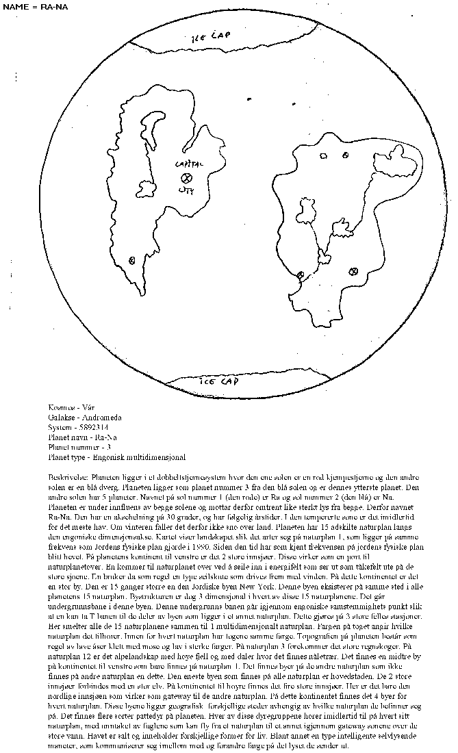 | Beskrivelse: Planeten ligger i et dobbeltstjernesystem hvor den ene solen er en rød kjempestjerne og den andre solen er en blå dverg.Planeten ligger som planet nummer 3 fra den blå solen og er dennes ytterste planet.Den andre solen har 5 planeter.Navnet på sol nummer 1 (den røde) er Ra og sol nummer 2 (den blå) er Na.Planeten er under innfluens av begge solene og motar derfor omtrent lige sterkt lys fra begge.Derfor navnet Ra-Na.Den har en aksehelning på 30 grader,og har følgelig årstider.I den tempererte sone er det imidlertid for det meste hav.Om vinteren faller det derfor ikke snø over land. Planeten har 15 adskilte naturplan langs den engoniske dimensjonsakse.Kartet viser landskalpet slik det arter seg på naturplan 1,som ligger på samme frekvens som Jordens fysiske plan gjorde i 1990.Siden den tid har som kjent frekvensen på jordens fysiske plan blitt hevet.På planetens kontinent til venstre er det 2 store innskjøer.Disse virker som en port til naturplanet over.En kommer til naturplanet over ved å seile inn i energifelt som ser ut som tåkefelt ute på de store sjøene.En bruker da fomregel en type seilskute som drives frem med vinden.På dette kontinentet er det en stor by.Den er 15 ganger større en den Jordiske byen New York.Denne byen eksisterer på samme sted i alle planetens 15 naturplan.Bystrukturen er dog 3 dimensjonal i hvert av disse 15 naturplanene.Det går undergrunnsbane i denne byen.Denne undergrunns banen går igjennom engoniske samstemmighets punkt slik at en kan ta T banen til de deler av byen som ligger i et annet naturplan. Dette gjøres på 3 store felles stasjoner.Her smelter alle de 15 naturplanene sammen til 1 multidimensjonalt naturplan.Fargen på toget angir hvilke naturplan det tilhører.Innen for hvert naturplan har togene samme farge. Topografien på planeten består somregel av lave åser klett med mose og lav i sterke farger.På naturplan 3 forekommer det store regnskoger.På naturplan 12 er det alpelandskap med høye fjell og med daler hvor det finnes nåletrær. Det finnes en midre by på kontinentet til venstre som bare finnes på naturplan 1.Det finnes byer på de andre naturplan som ikke finnes på andre naturplan en dette.Den eneste byen som finnes på alle naturplan er hovedstaden.De 2 store innskjøer forbindes med en stor elv.På kontinentet til høyre finnes det fire store innskjøer.Her er det bare den nordlige innskjøen som virker som gateway til de andre naturplan.På dette kontinentet finnes det 4 byer for hvert naturplan.Disse byene ligger geografisk forskjellige steder avhengig av hvilke naturplan de befinner seg på. Det finnes flere sorter pattedyr på planeten.Hver av disse dyregruppene hører imidlertid til på hvert sitt naturplan,med untaket av fuglene som kan fly fra et naturplan til et annet igjennom gateway sonene over de store vann.Havet er salt og inneholder forskjellige former for liv. Blandt annet en type intelligente selvlysende maneter,som kommuniserer seg imellom med og forandre farge på det lyset de sender ut. |