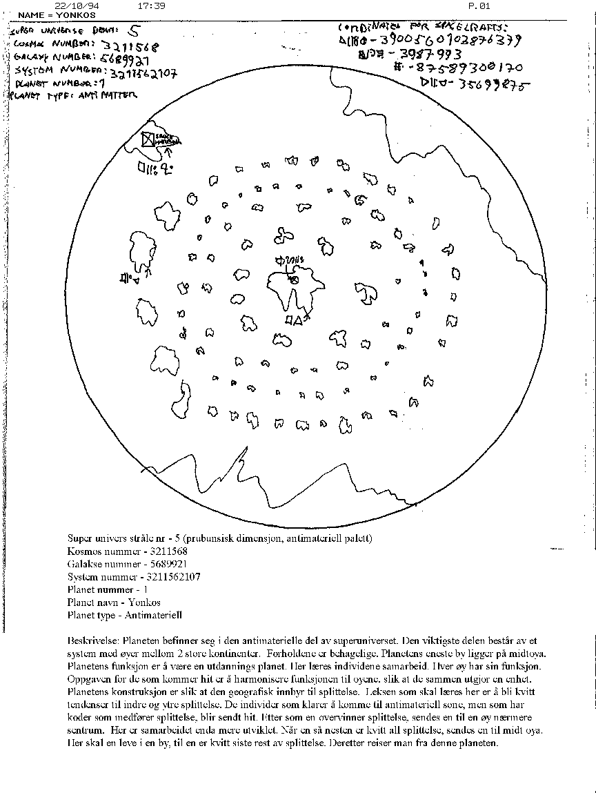 | Beskrivelse:Planeten befinner seg i den antimaterielle del av superuniverset. Den viktigste delen består av et system med øyer mellom 2 store kontinenter. Forholdene er behagelige.Planetens eneste by ligger på midt-øya.Planetens funksjon er å være en utdannings planet.Her læres individene sammarbeid.Hver øy har sin funksjon.Oppgaven for de som kommer hit er å harmonisere funksjonen til øyene,slik at de sammen utgjør en enhet. Planetens konstruksjon er slik at den geografisk innbyr til splittelse. Leksen som skal læres her er å bli kvitt tendenser til indre og ytre splittelse.De individer som klarer å komme til antimateriell sone,men som har koder som medfører splittelse,blir sendt hit.Etter som en overvinner splittelse,sendes en til en øy nærmere sentrum. Her er samarbeidet enda mere utviklet.Når en så nesten er kvitt all splittelse,sendes en til midt øya.Her skal en leve i en by,til en er kvitt siste rest av splittelse.Deretter reiser man fra denne planeten. |