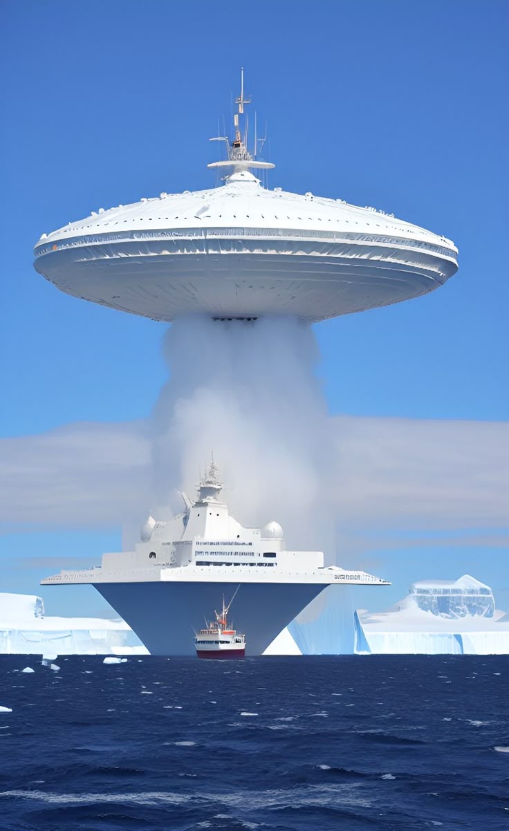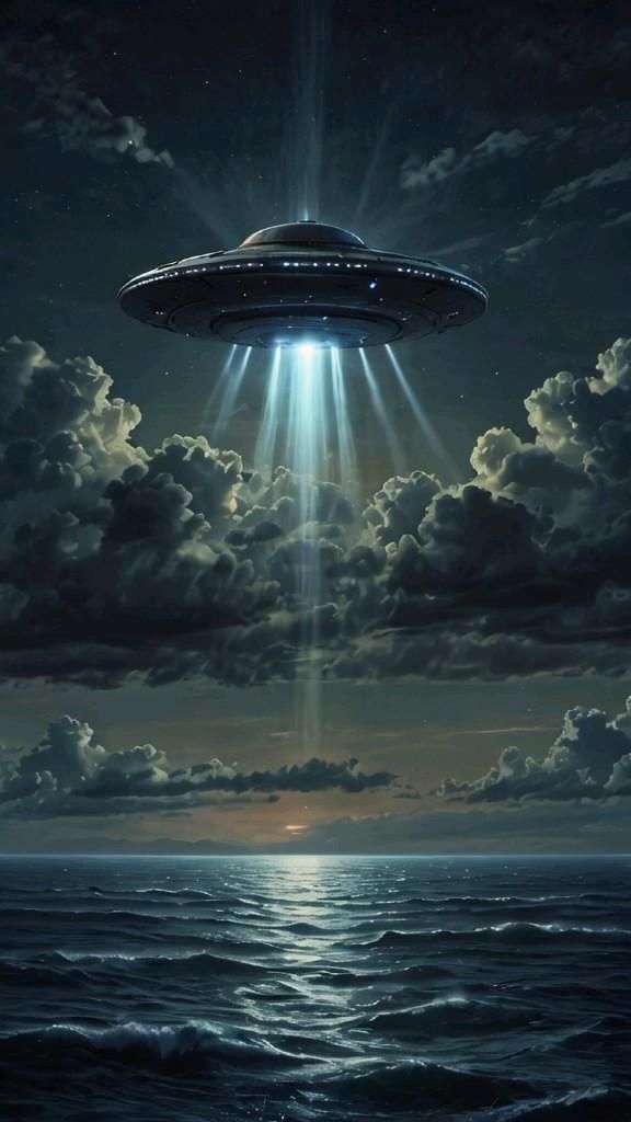 Spaceship hovering over sea ships.