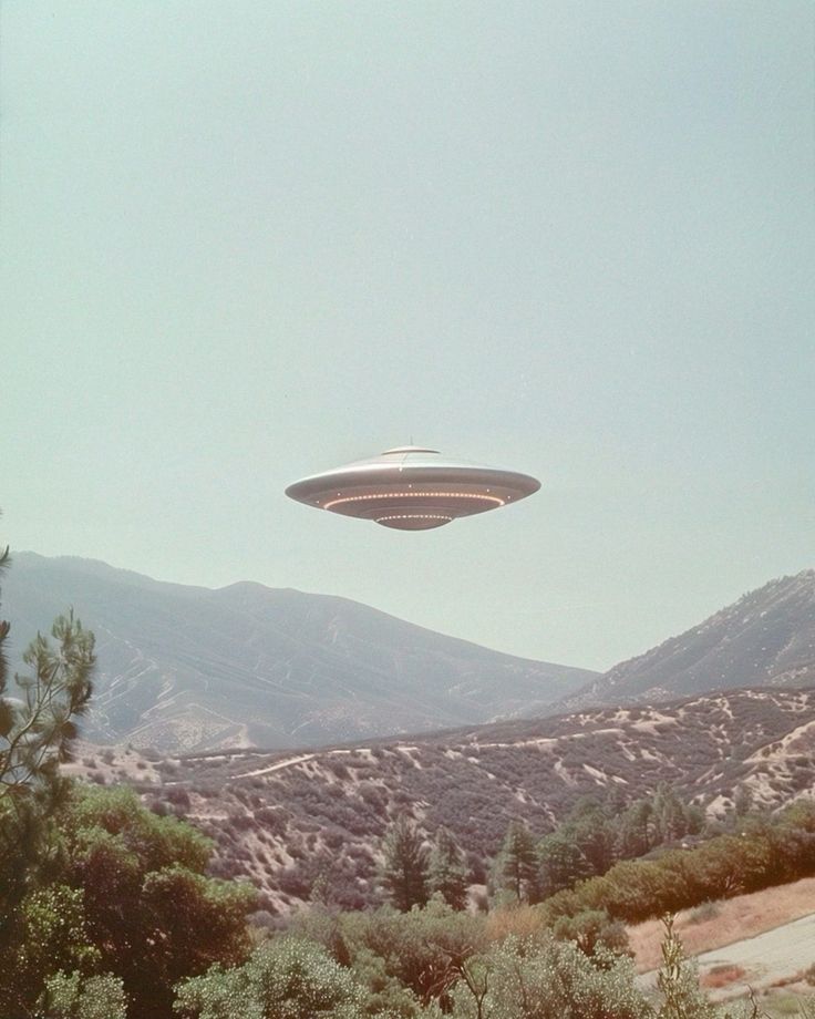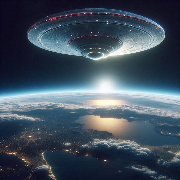 Spaceship over landscape.